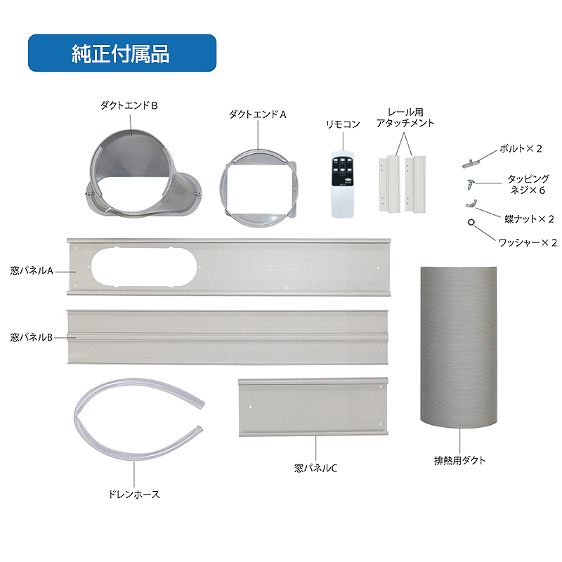 | 付属品 | ワイヤレスリモコン 排熱ダクト付属/外径 約Φ15cm、長さ 約25~150cm 窓パネル付属/取り付け幅 72~144.5cm ドレンホース(排水用) |